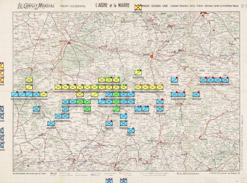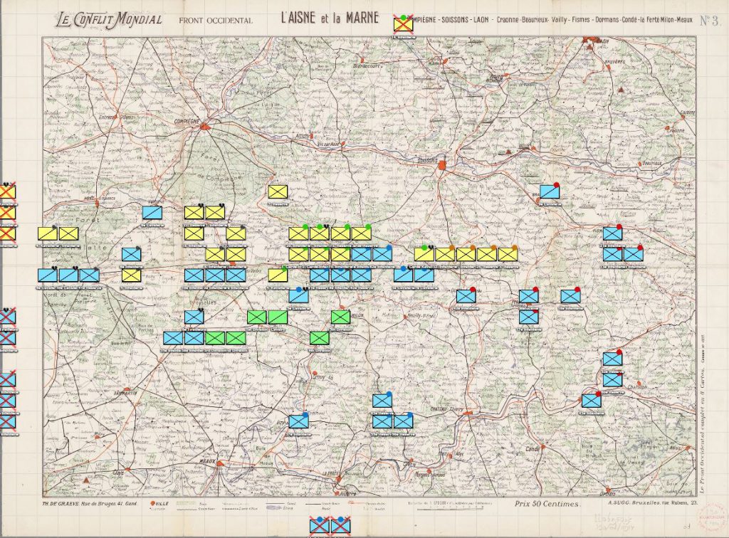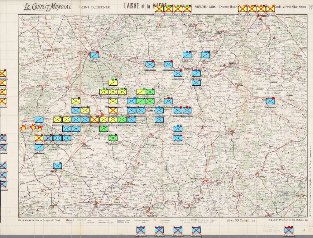 Kriegsspiel is traditionally used to play out the Napoleonic wars, or other 19th century conflicts. That’s what it was designed for. I’m more of a 20th century guy, and whilst there are hacks available for doing WW2 and the like they all felt like they had more complex mechanics than I wanted for an introductory game. I’d been reading The Guns of August at the time and so 1914 was at the forefront of my thinking. The first battle of the Marne felt like a good fit, the last gasp of that 19th century war of manoeuvre, with the whole bloody 20th century stretching out ahead of it. It’s the battle that effectively ended the threat to Paris and precipitated the “race to the sea” that ends with the trench warfare that defined the western front for the rest of the war.