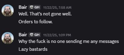 What made Kriegsspiel such a great sell for me was this: There’s no requirement for the players to know any rules. Selling new games to people can be hard, there’s typically a huge amount of learning frontloaded. With Kriegsspiel basically all of the mechanical work is done by the umpire, away from the prying eyes of players. From a player perspective the gameplay loop is really simple: you send out your orders to the umpire, wait a bit and then the umpire tells you what happened. Rinse and repeat until the game ends. You send messages to other players as well, but that all goes through the umpire.