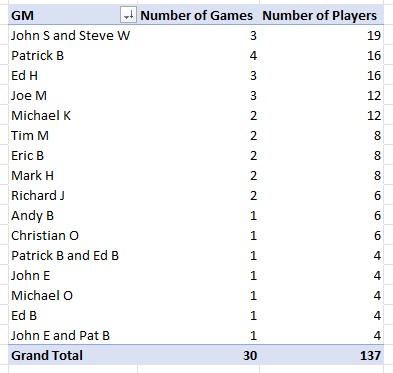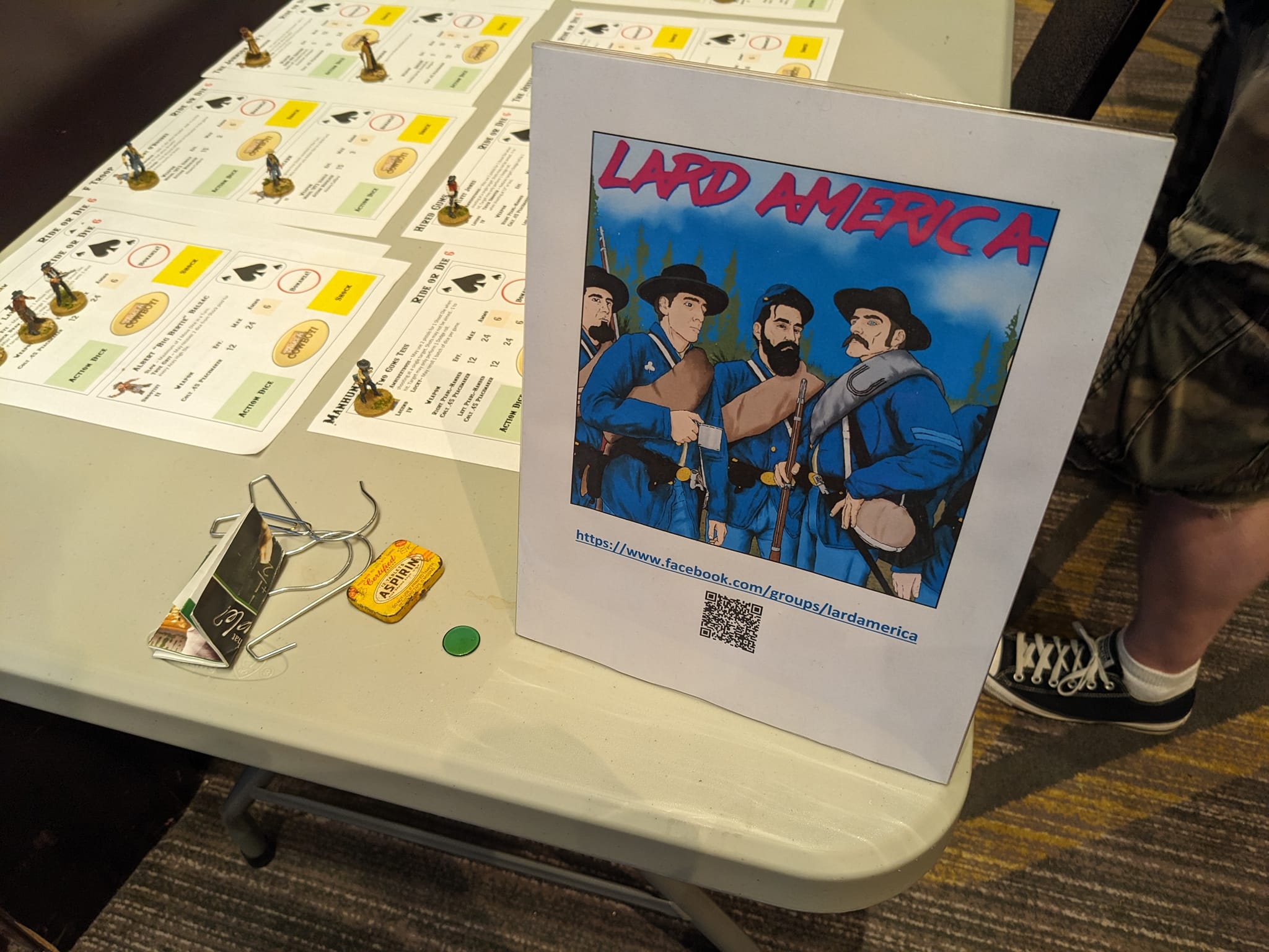 Lard America is an email/Facebook group of individuals all over America, Canada, etc. We collaborate and meet up at conventions to run games together. I was impressed by the number of games we offered this time. See below: