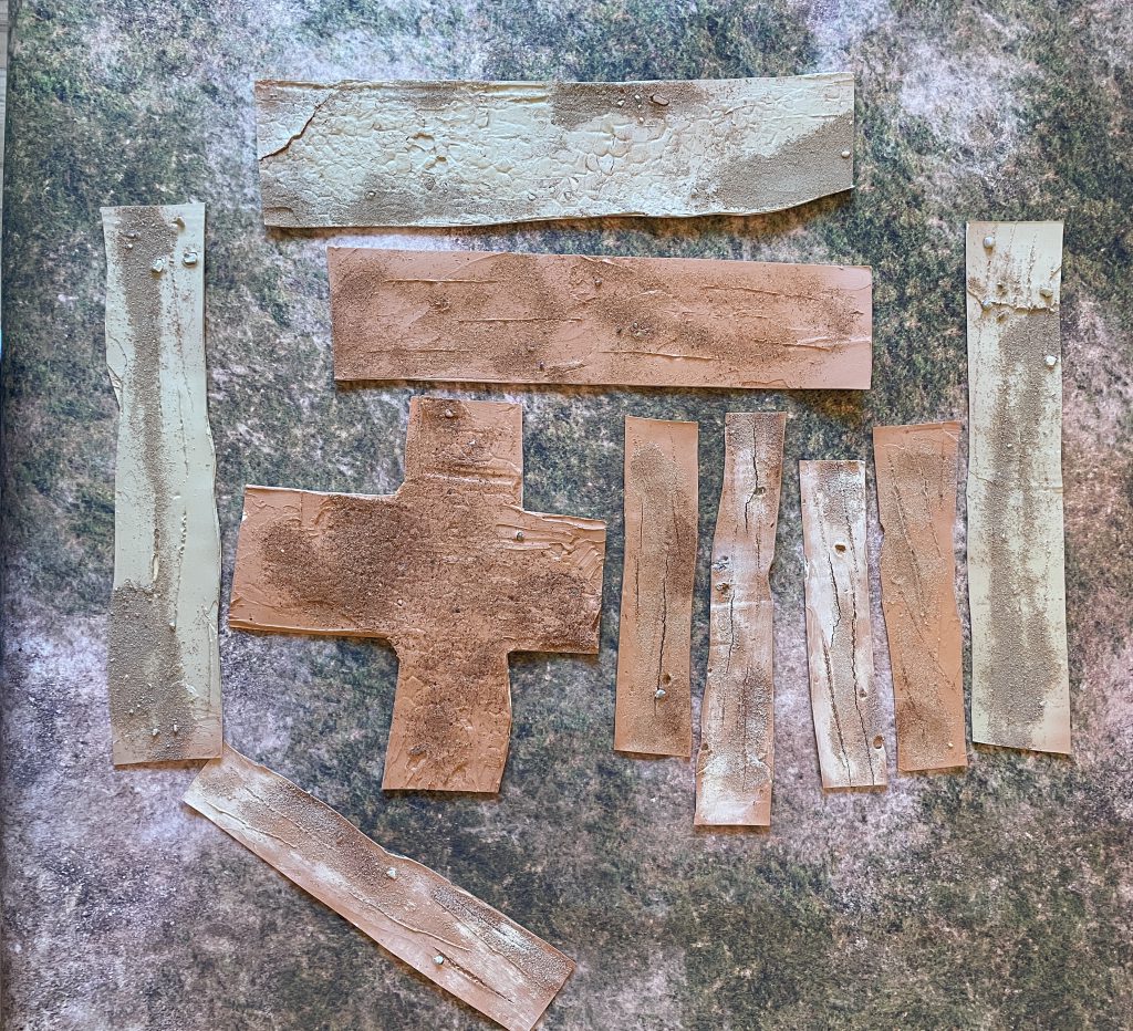 One of those details will be more paths and roads, which means I've picked up more caulk. This time I'm trying out coloured sealant in a light red-brown. I've read a lot about caulk roads curling and peeling, so have tried out a different way of backing the caulk lines while they dry to keep them level. Thin, shopping-bag plastic doesn't work well, but thick paper/card for watercolours does! The road network production line is well underway:
