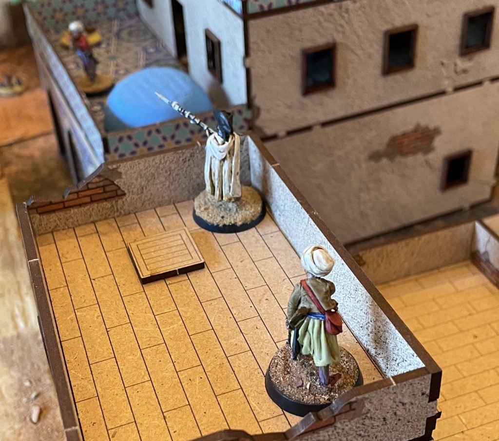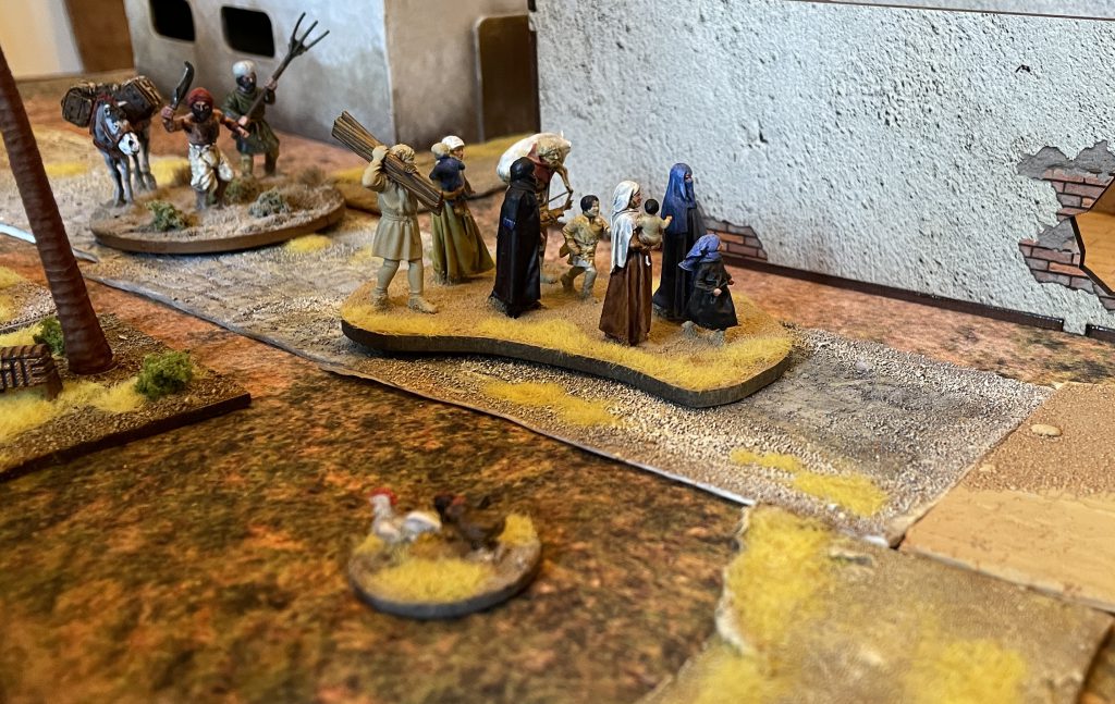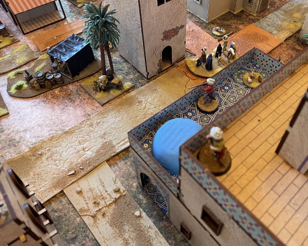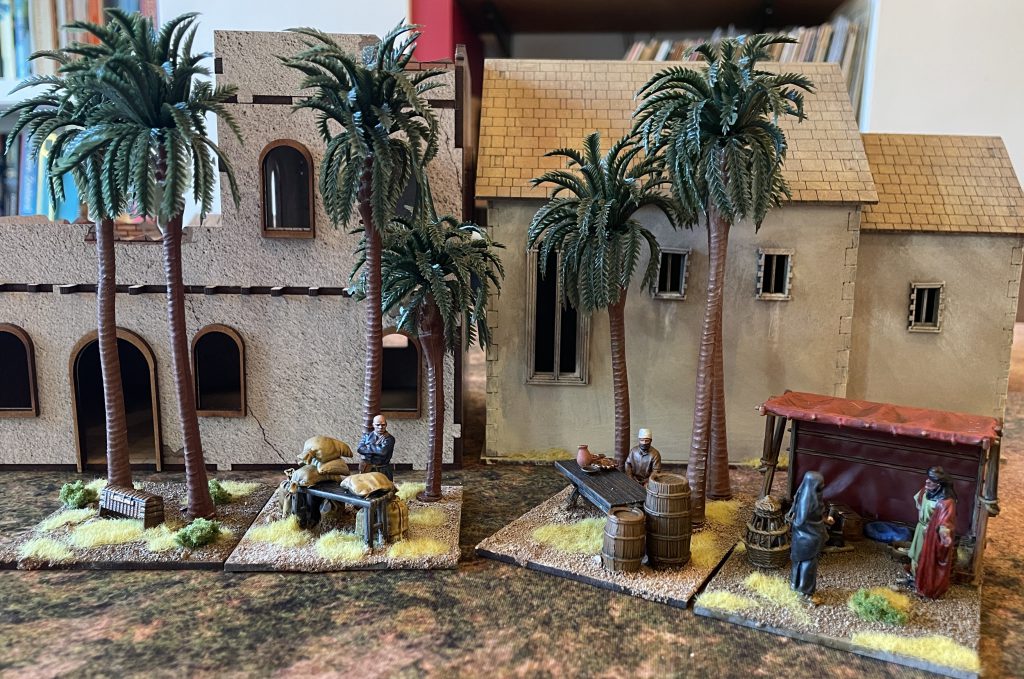 The Victrix Market set has provided the majority of the market town terrain needed for this month's plans, with two market stalls and several smaller pieces of scatter representing places to buy and sell. To give them a little more Egyptian theming, I've used Islamic and Western Medieval civilians from Reconquer designs and very cheap plastic Temu palm trees. Mixed in with some of the Bandua Medina buildings, this board feels different to the rural village while using most of the same pieces.