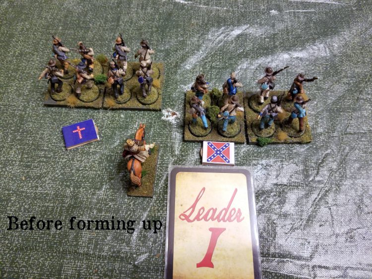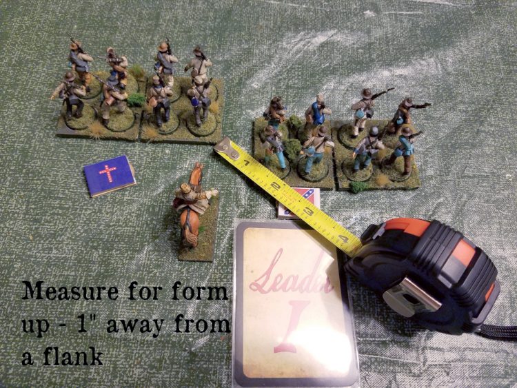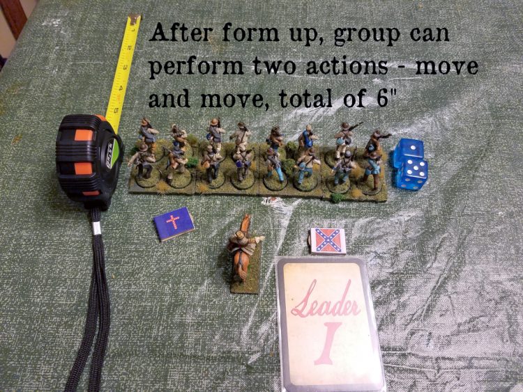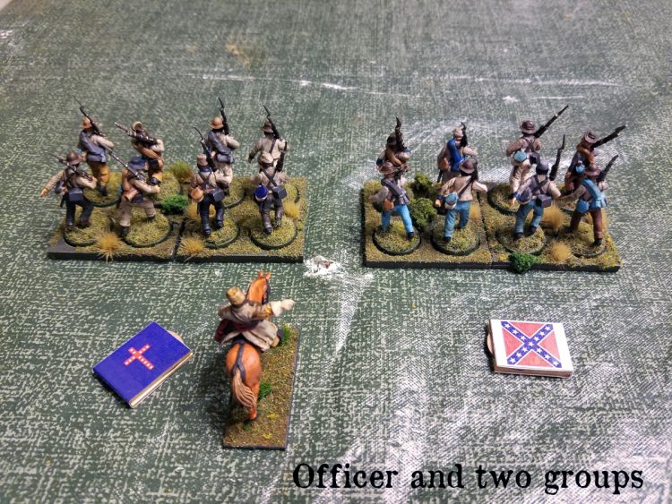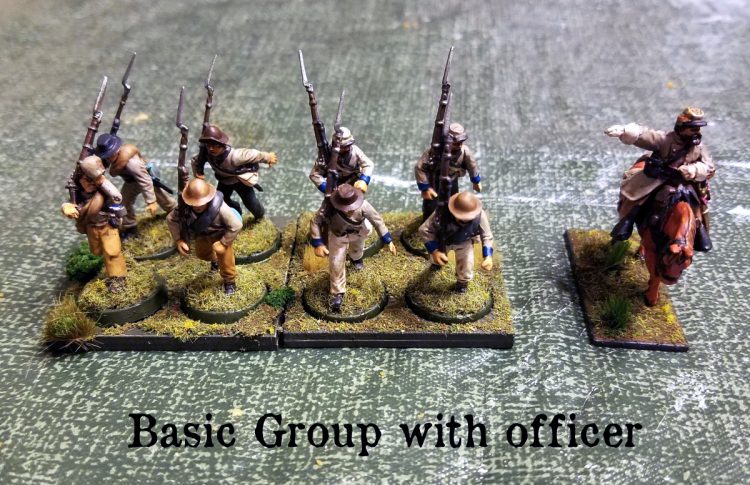 Above is a basic group of infantry for the ACW period - eight men with an officer. For the sake of the demonstration, he's Status Two. They always operate in stands of four guys together.