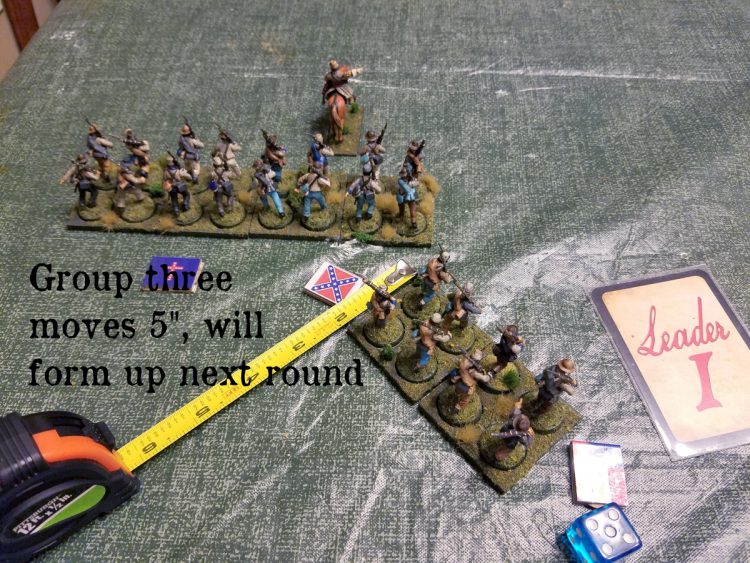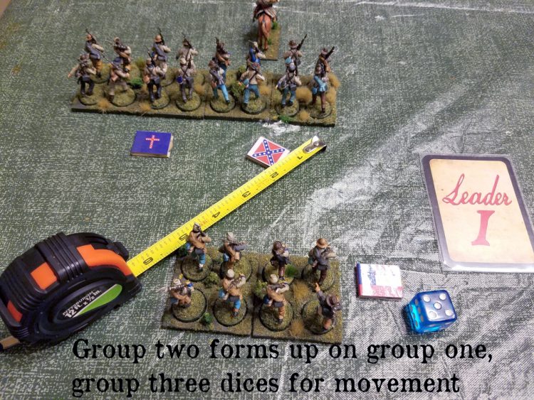 In this case, group two forms up automatically since they're in a march column. Group three will have to dice for movement and rolls a five.