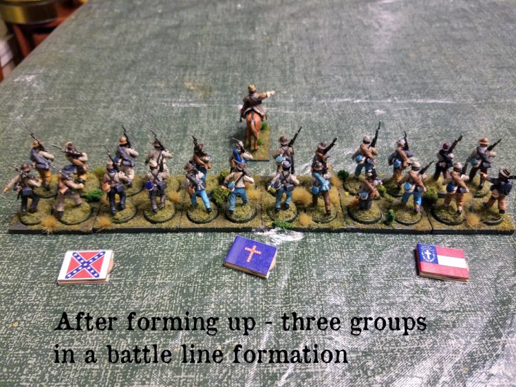 Lets say we now have three groups together in a formation, and they're in an open march column as they haven't yet encountered the enemy. However they've spotted skirmishers in their front and need to shake out into a battle line.