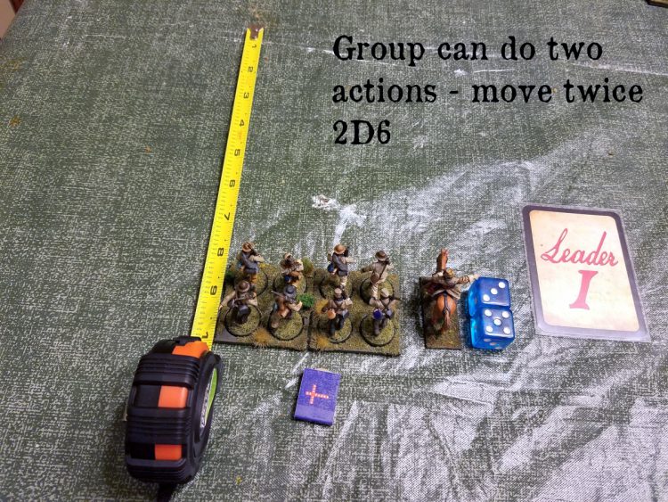 When the leader's card is dealt, in this case number one, he can command a group or formation to do two actions (this is one of his initiatives, out of two). In this case, this group has chosen to use two actions to move - so they roll 2D6 and move that far. I'll talk more about the random movement later.