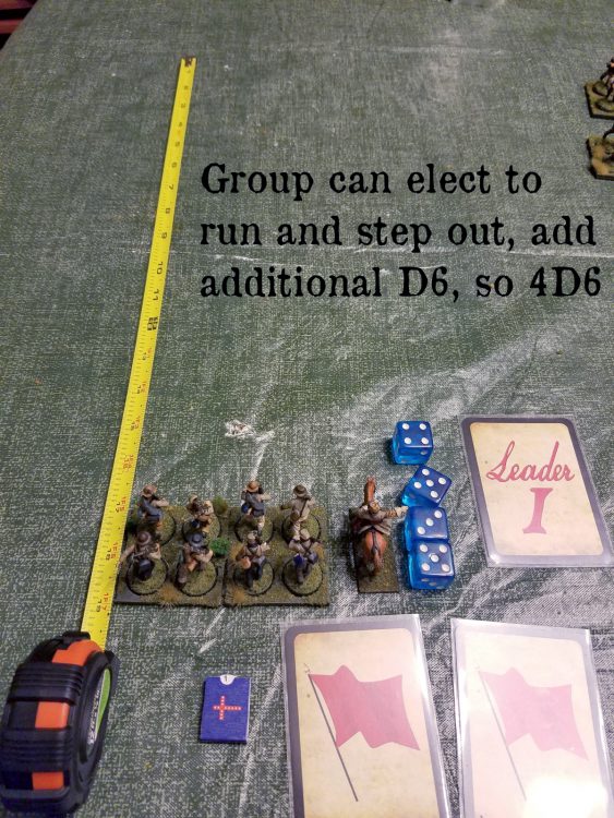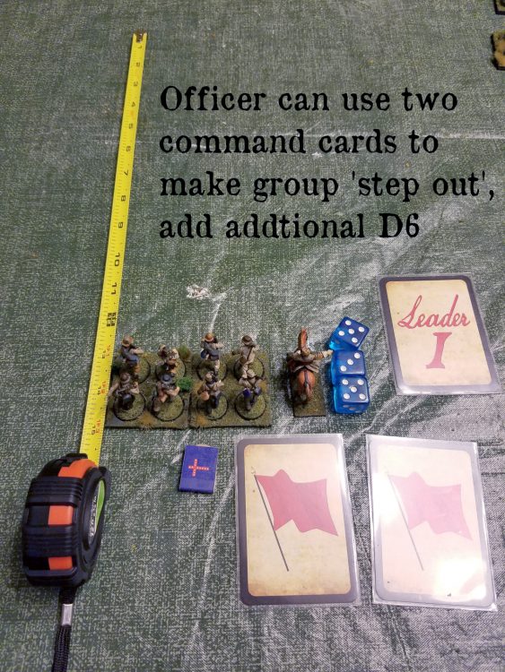The officer can also use two command cards to make the group 'step out'. The number of cards used to do so is based on the troop quality, motivation, and period, but two seems fairly standard. The commander is urging his troops forward. They gain an additional die of movement.