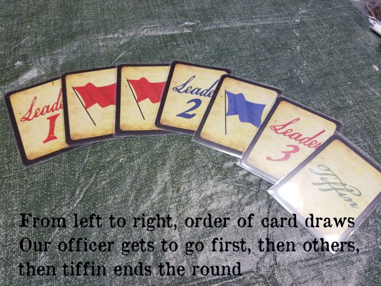 Here you can see a demonstration of how cards are drawn. Our leader (one) went first, then we got some command cards that we can use to enhance our troops, then the leader two from our opposition went, then our leader three, and then the Tiffin, which ends the round.