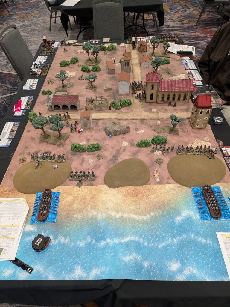 Our scenario was part of Winfield Scott's campaign to take Vera Cruz. His plan was to land on the coast and take strategic points as well as take supplies. For this particular scenario we had two surfboats landing with sailors at the coast. Once they had landed (after the turn of a few blank cards) then the US soldiers could deploy from those boats as their deployment points. The Mexican defenders could move and deploy while the boats were rowing, trying to get into position. They could post the Mexican flag on the church in town to call in reinforcements.