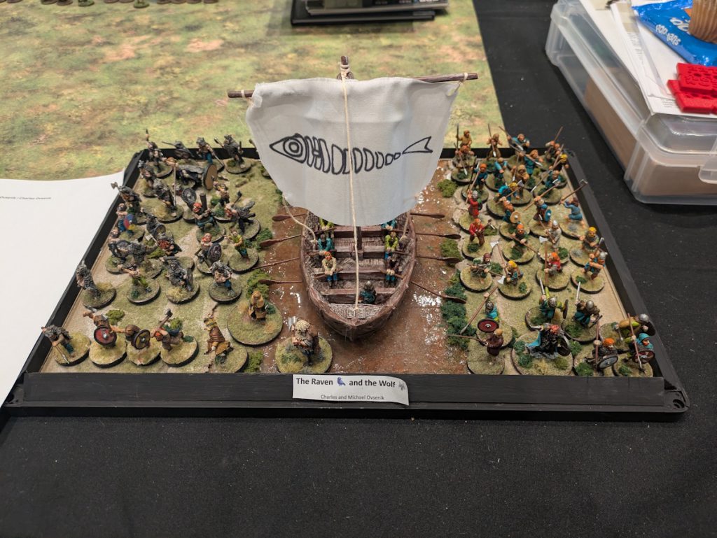 The final game was a King of the Hill type scenario where we had to fight and hold a hill in the center of the board. It was an interesting mission - scoring units had to be on the hill, so they couldn't be exhausted or under minimum number to generate a SAGA die. We were lined up against Vikings and Irish, so we knew what to do pretty well. Both sides moved forward near the hill and attempted to hold it. We got points for killing units on the hill, killing warlords on the hill, and just killing models on the hill. We managed a few kills that were really good at fatigue bombing the enemies (as fatigue bombs would go from teammate to teammate). We ended up winning in a close but really fun match! We actually had back to back Ragnaroks in our game, so we shouted 'RAGNAROK' each time as is the custom at the Grand Melee.