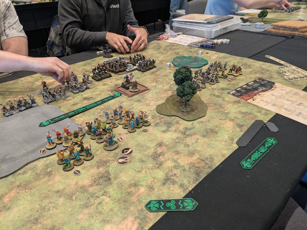 I broke my warriors up into two groups of six, had a group of six hearthguard, and two groups of six levy. The hearthguard were there to use Norse to boost their armor and Determination to win a melee and then be un-chargeable. The rest of my guys were there to Spill Blood and use a bunch of extra combat die with Heavy Weapons to take down hard targets.