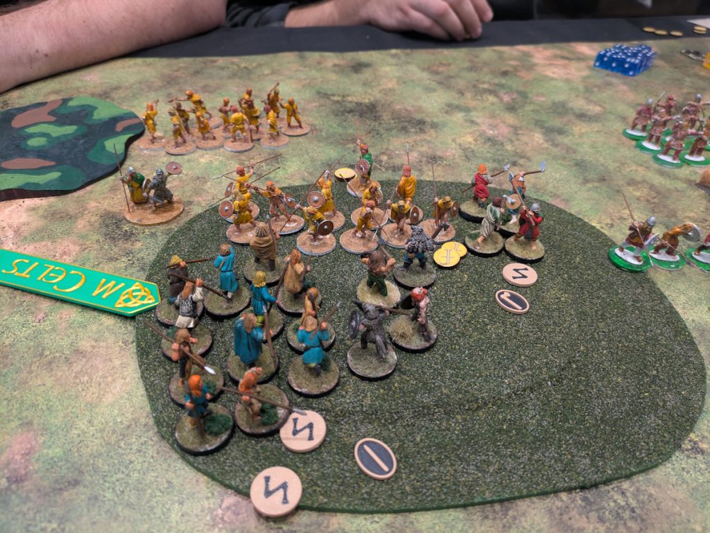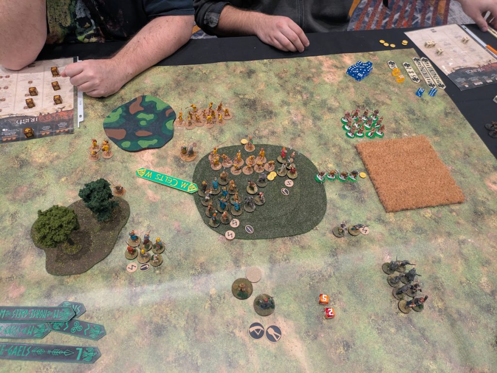 Overall we had a great time. Game one we faced off against Last Romans and Anglo-Danes. It's been a while since I played against Anglo-Danes - they're tough! The Last Romans are great at shooting and really ground us down. In the end we tried some late-game Warlord runs that didn't work out. We lost game one but had a good time. SAGA is a game where you have to plan out your turn, obviously, since you have to put all your dice down and then think about what you're doing. Norse-Gaels are definitely about powering up a dice machine - and if you do a step wrong or out of turn then you can screw it up. I definitely screwed mine up the first or second turn, probably both. The first scenario has us fighting it out in the middle with a champion, while our guys nearby would fight and score points for kills.