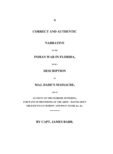 A Correct and Authentic Narrative of the Indian War in Florida, With a Description of Maj. Dade's Massacre, and an Account of the Extreme Suffering, for Want of Provisions, of the Army - Having Been Obliged to Eat Horses' and Dogs' Flesh, etc. etc. by Capt. James Barr.