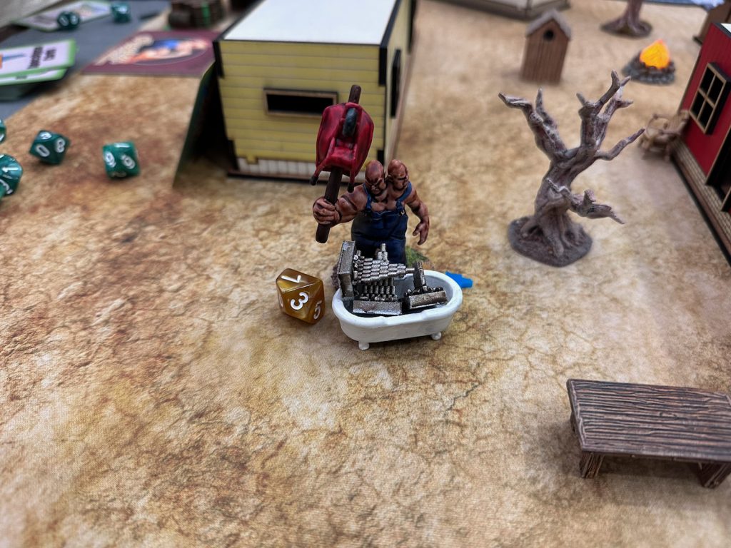 Trailer Park Warlords of the Apocalypse is a small skirmish warband or gang game where each side brings around eight miniatures. D10s are used to roll against a target number (TN) to score hits or measure success. Rowdies (the game's term for a fighter, gang member, etc.) take damage by rolling against a TN of 5+ however many successful hits the enemy had - so if a Rowdie is hit by three hits, they need to save vs 8+. They roll 2D10 and try to get an 8 or better. If neither number is equal to or lower than the weapon's kill rating, then the Rowdie receives a Winded token. Once a Rowdie receives twice as many Winded tokens as their Stamina, they're killed. Humans, as an example, have a Stamina of 3.