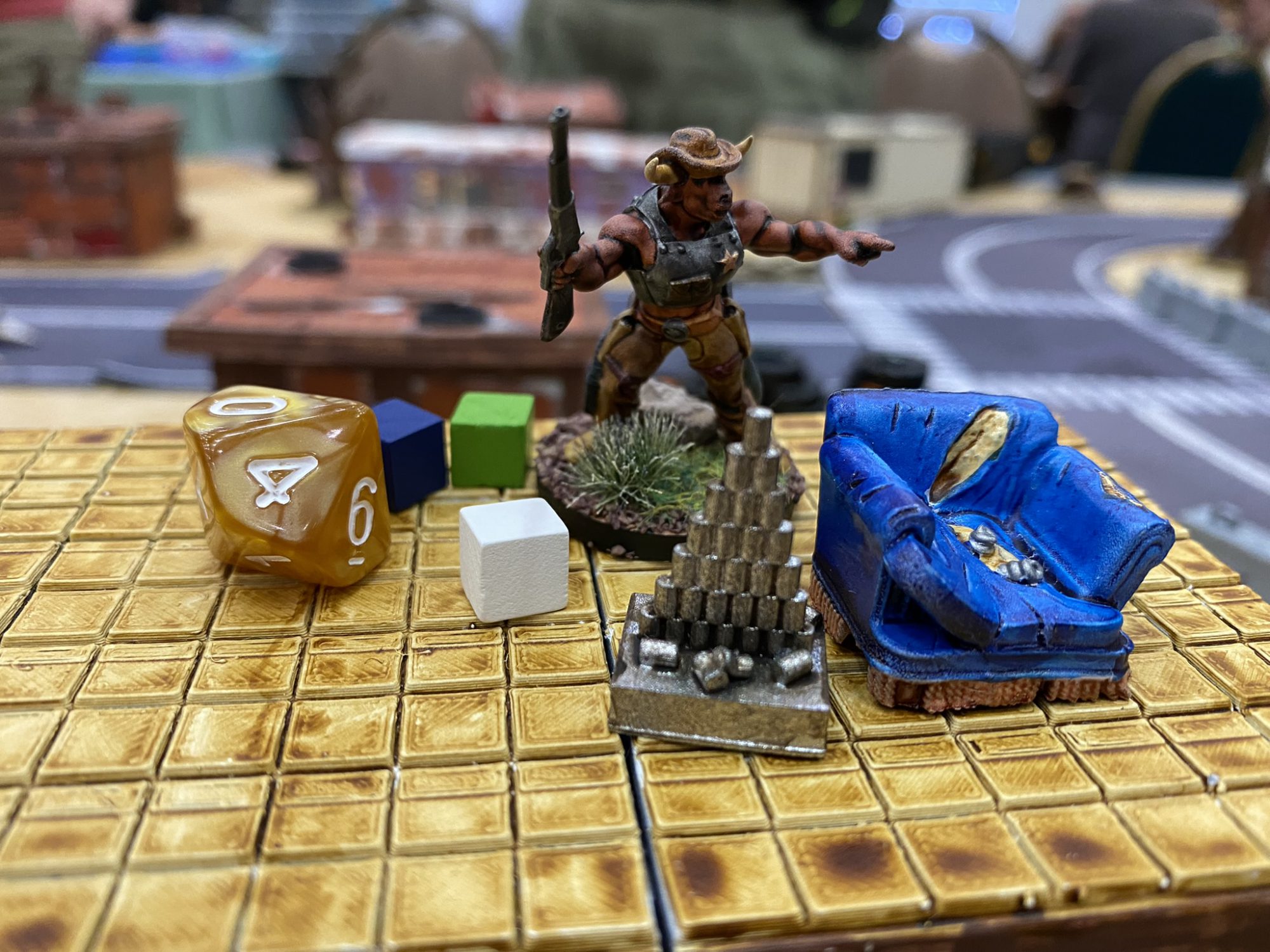 Each player bids for initiative in a turn - so you need to use your resources wisely. For each Rowdie in play, you roll a D10 and set it aside. Once the turn starts you can choose one of these and secretly put it in front of you - then both players reveal and whoever has the higher die goes with an un-activated model of their choice - a pretty interesting resource mechanic with bluffing and layers of strategy involved. Add in Apocalypse Cards that are small little bonuses you can play during the game and it makes it not just a move, shoot, fight game. Each Rowdie has a Fighting, Shooting, Guts, Stamina, Speed, Mutations, and Cost stat.