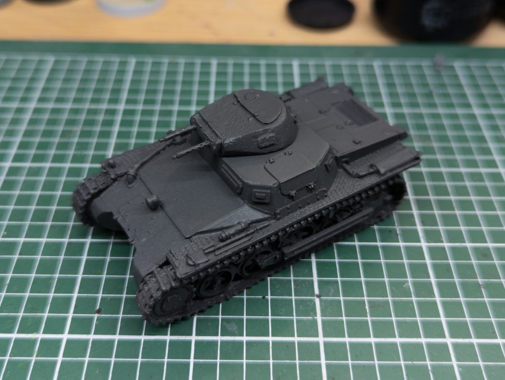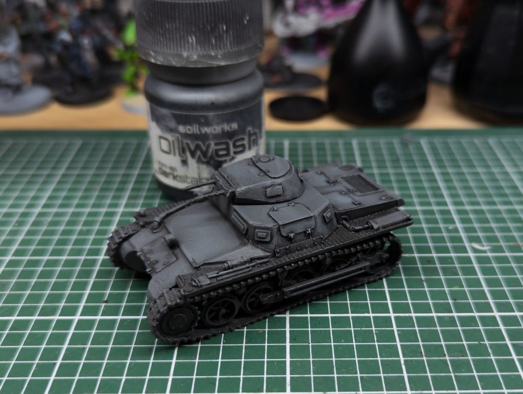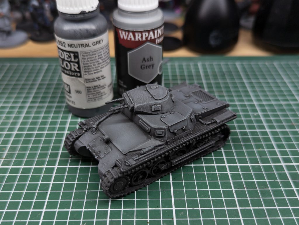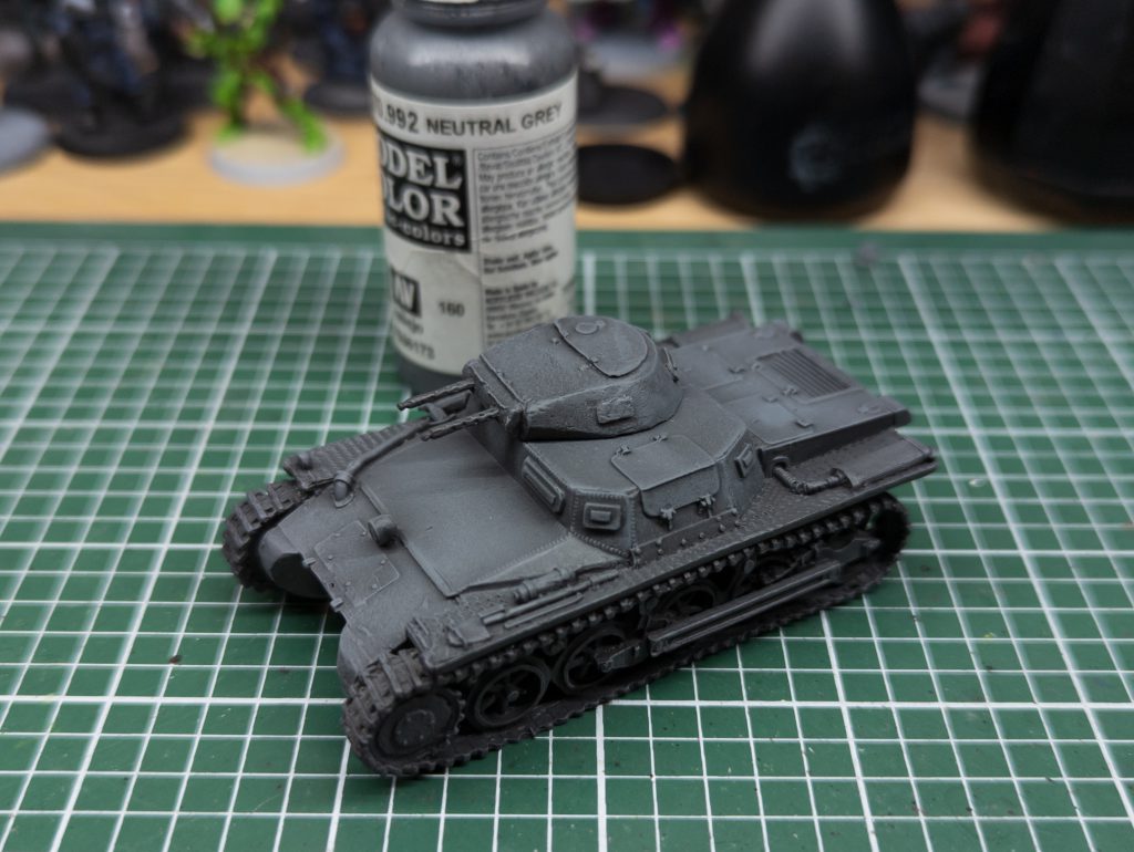 You want to begin with a primer coat of Vallejo's Panzer Grey. Make sure this covers well, as it will serve as the shadow coat and bare plastic, metal or resin poking out in recesses is gonna look pretty bad. If your vehicle is made out of metal or resin, you can spray a lot more intensely since the primer can't harm the material, but you also want to give the tank a layer of matt varnish after priming to strengthen the basecoat. If the vehicle is plastic, however, you want to use multiple careful coats, should you not be able to reach the deeper recesses, you can use Vallejo's German Grey or a similar dark grey to cover up those areas.