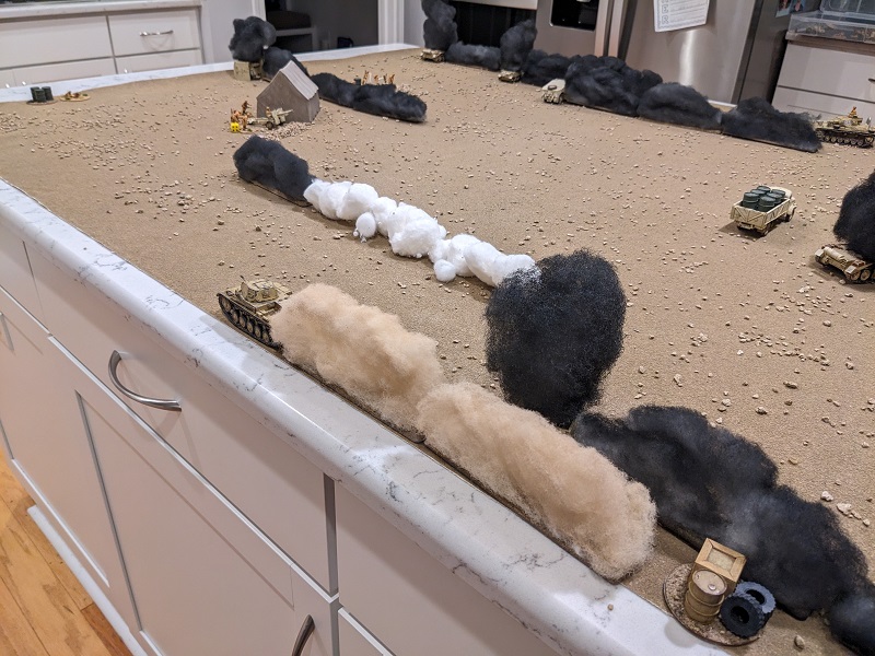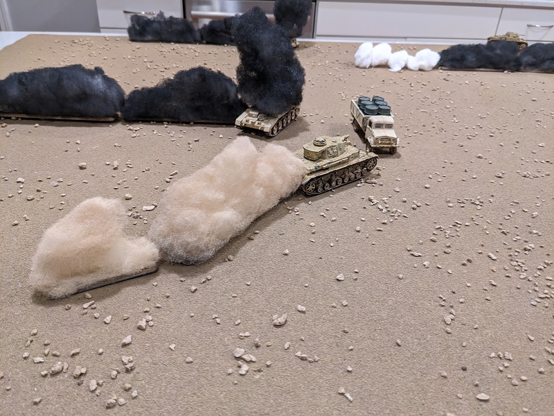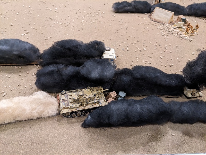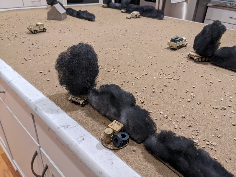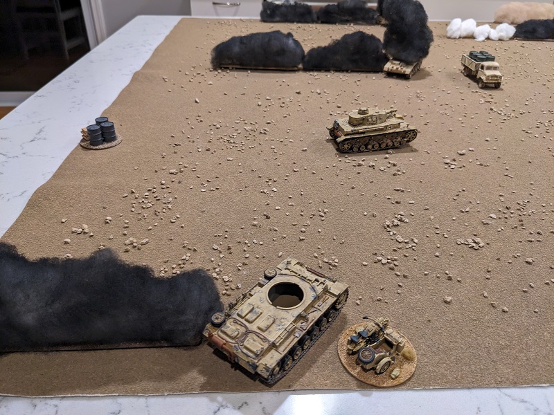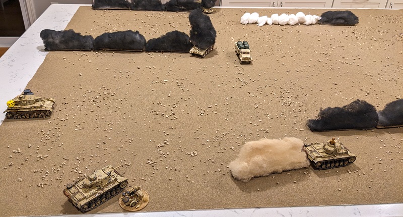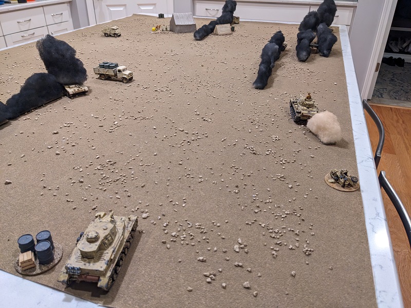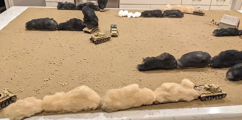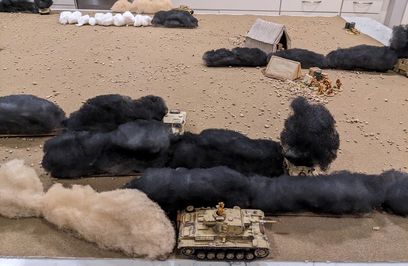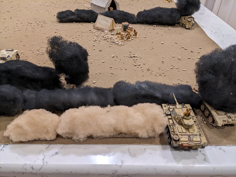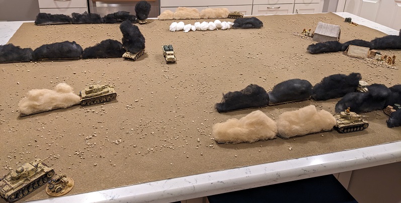 The wind direction has shifted since the last battle was fought, now blowing directly from north to south. This aligns the plumes of smoke along the German line of advance, and combined with the placement of the wrecks around the periphery of the board portends that this scenario is going to be a shooting gallery with very little obstruction in the middle of the table (at least until the South African support vehicles start moving or get destroyed).