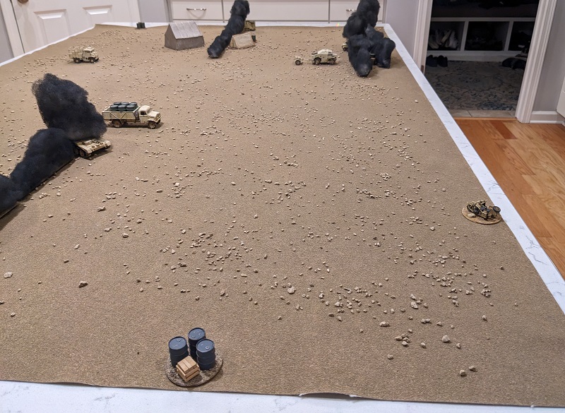 Randomizing the location of everything per the campaign rules led to a situation where the burning wrecks were largely concentrated on the northern side of the field. The one closest to the German baseline was actually snugged up almost all the way along the western board edge. The two ammo trucks were situated on the South Africans' half of the table, one to the east and one to the west of center. But the fuel truck was situated directly south of board center and relatively close to the German baseline. A tempting target indeed!
