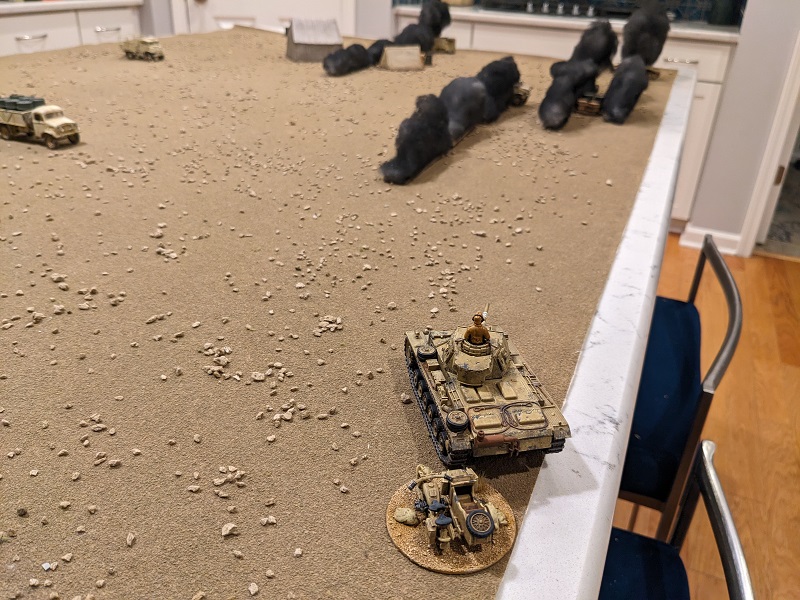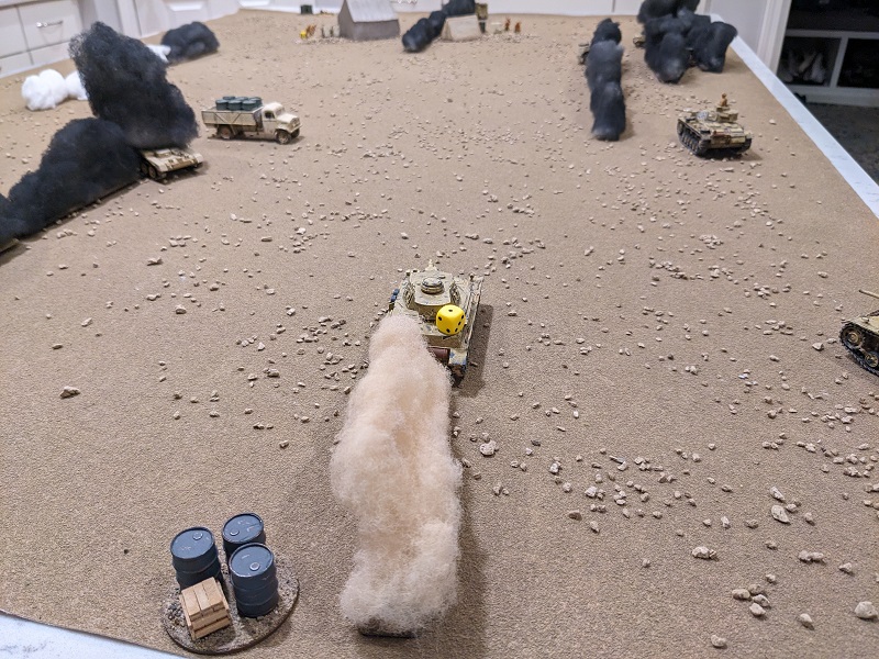 Turn 1, Phase 18 (German): 54222 - With this roll only allowing Krauss to activate, this phase was once again all about the radio. One CI went to the Pz II C, which once again sent a stream of 20mm shells at the 25-lb gun. A hit was scored, but it was on the already-unconscious Sergeant Cameron and would have knocked him unconscious again, so it was ignored. The Pz IV D was ordered to advance, rumbling 9" forward and getting close enough to force the surrender of the fuel truck, which hadn't moved all game. Try as he might the driver still hadn't gotten the vehicle started! But more importantly, the Pz IV D could now claim to be partially obscured behind the fuel truck, at least from the line-of-fire of the deadly 25-lb artillery gun. Finally, the German Leutnant ordered his own driver to step on it. The command tank surged forward 12", putting it perilously close to the northern board edge should an Armored Advance be called for.