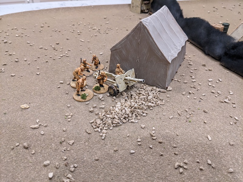 The 25-lb gun is deployed. Though digging a real gun emplacement is impossible in this terrain, a hasty sangar has been erected to provide a little more cover from small arms fire. (credit: Ilor)