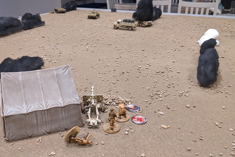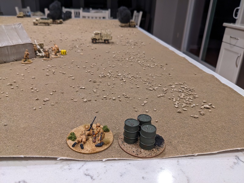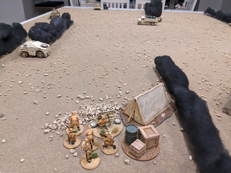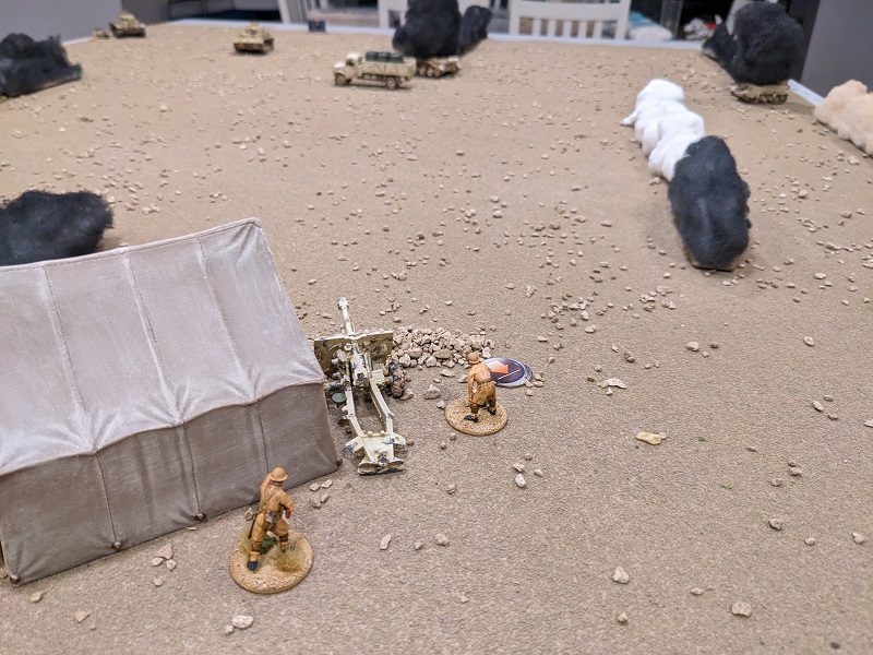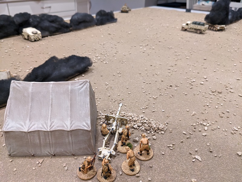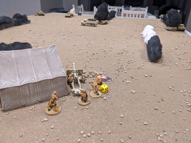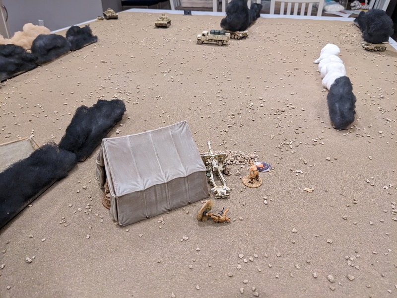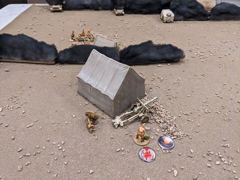 Turn 1, Phase 2 (South African): 33222 - Wow, that was a great roll! The 25-lb gun easily passed the roll to deploy through the opening barrage (along with its associated entrenchment), setting up next to the HQ tent and sighting straight over the barrel at Krauss' command tank (which suddenly felt