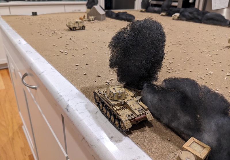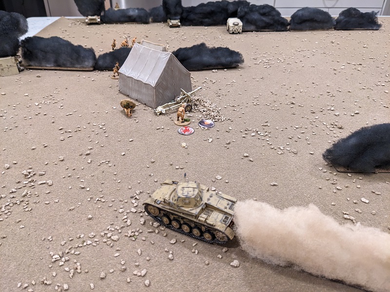 Turn 1, Phase 5 (German): 64433 - Via radio, Krauss commanded the Pz II C to engage the 25-lb gun once more with its 20mm autocannon, tacking 2 Shock back onto that team. Not wanting to leave anything to chance, Krauss then ordered his gunner to direct another 50mm round into the second ammo truck, which exploded in a massive ball of fire. His driver continued to advance north, now well-screened from the South African AT assets by plumes of smoke. Recovering their wits, the Pz IV D rumbled back onto the table, its commander removing a point of Shock and directing more HE at the enemy 25-lb gun. The shot was a little low, but the shower of dirt over the South Africans added another Shock. Finally, Dieter Bauer's tank deployed. It too opened up on the enemy artillery piece with both its main cannon and hull MG, all to no effect. Turns out maybe that sangar was doing some good after all!