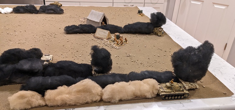 Aside: the campaign allows for the option of placing an additional burning vehicle for each tank destroyed in a previous game if the Germans are forced to re-fight a scenario, but I'm not sure I have enough smoke to represent the carnage from the last game, so I opt not to.