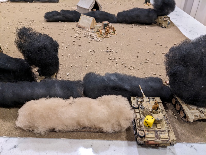 Turn 1, Phase 29 (South African): 23 - It felt like it all came down to this. Having hit Krauss' stationary tank repeatedly and with the gun-crew chief able to direct its fire, the roll only needed to be like a 6 on 2D6 to hit even with the heavy obscuration of the smoke. Sadly, the roll was a 4, a complete miss.
