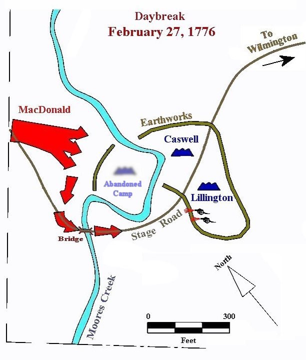 Meanwhile, Patriot forces under Colonel Caswell reach Moore's Creek Bridge and create an encampment on the west side of the creek, on the approach the Loyalists would take. The real earthworks are then dug on the east side of the creek by Caswell and Lillington's men.