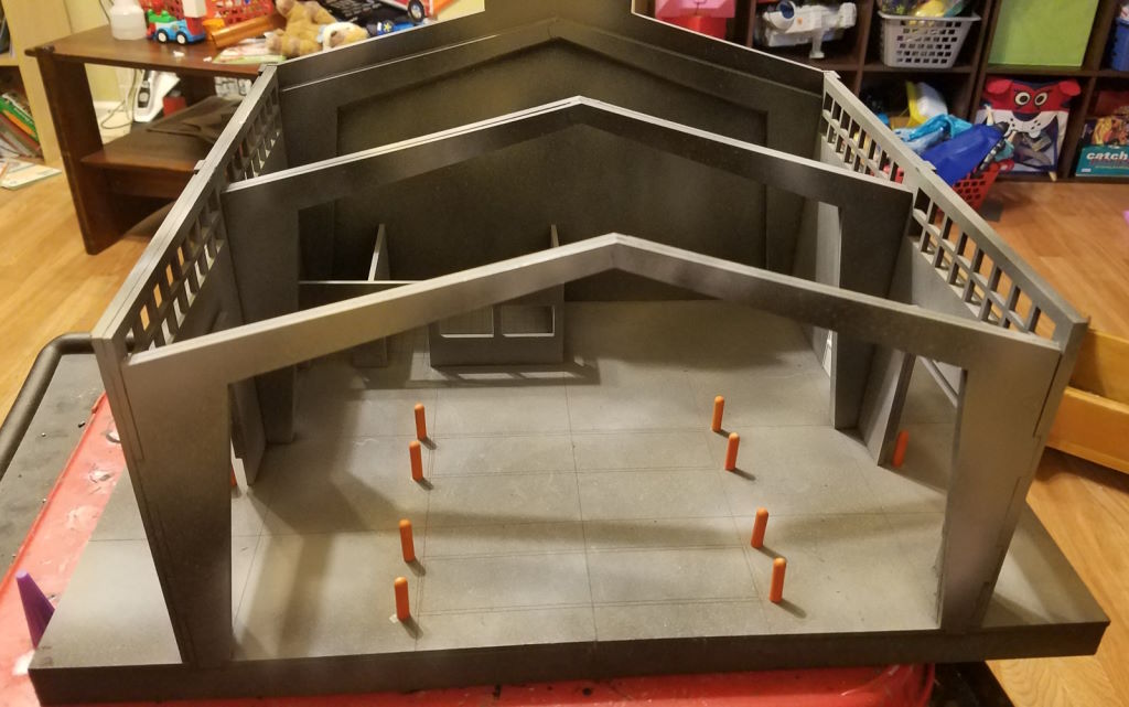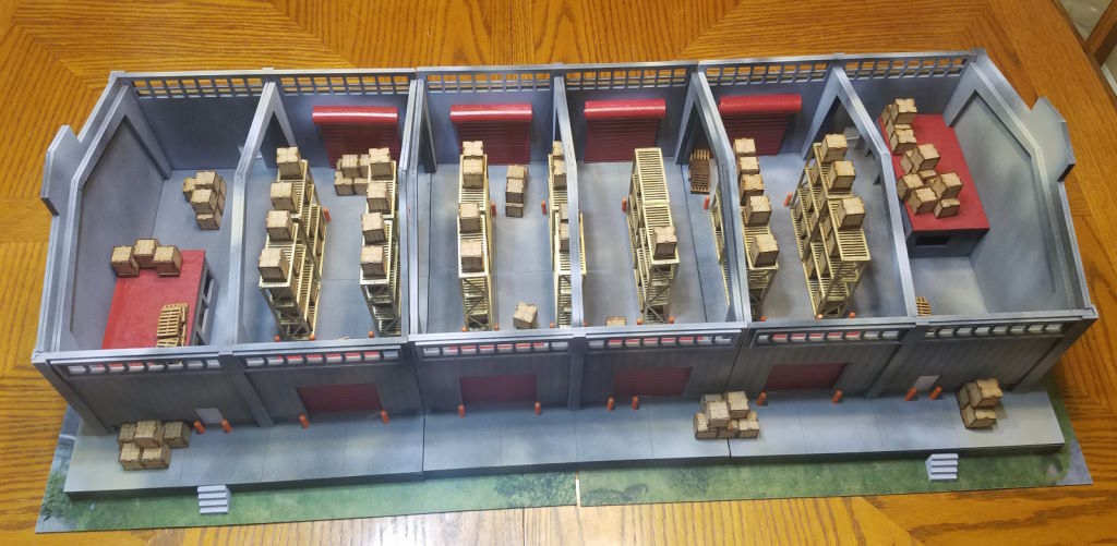 There are two end sections that are identical and one middle section to go between. You could definitely just use the two end sections if you wanted a smaller warehouse. There are magnets that are included so you can put the garage doors on and off easily. My resin doors chipped a little at the bottom when I cleaned flash, but I was able to file them down (with a mask on) and they’re fine.