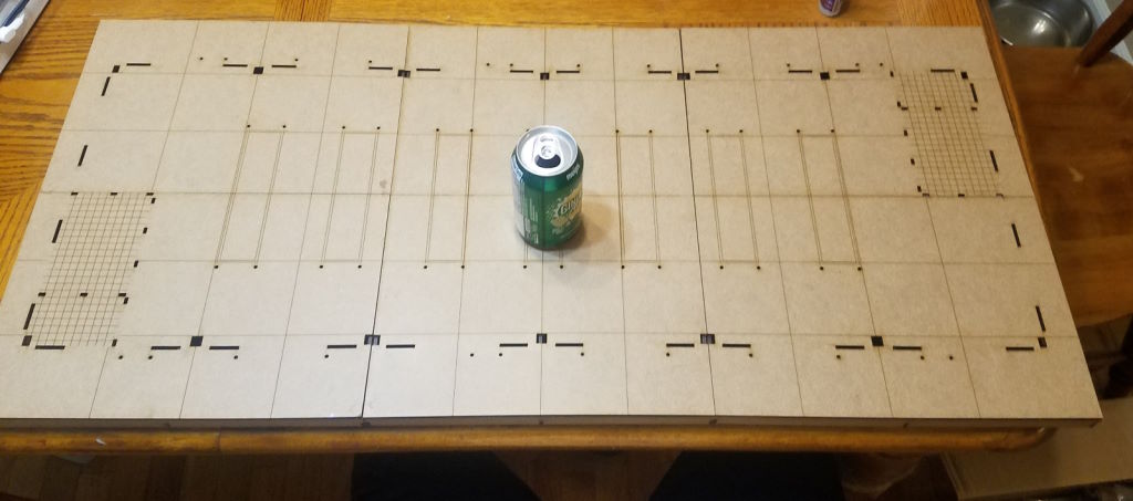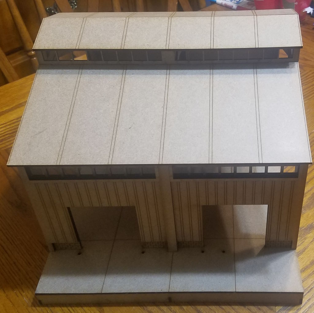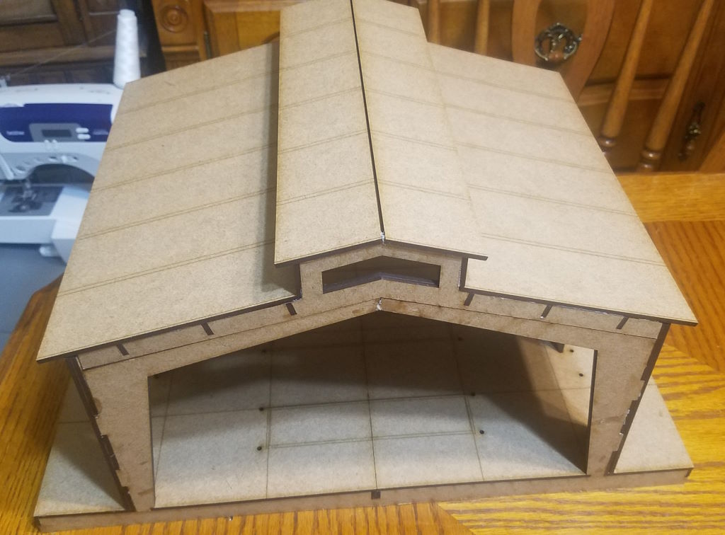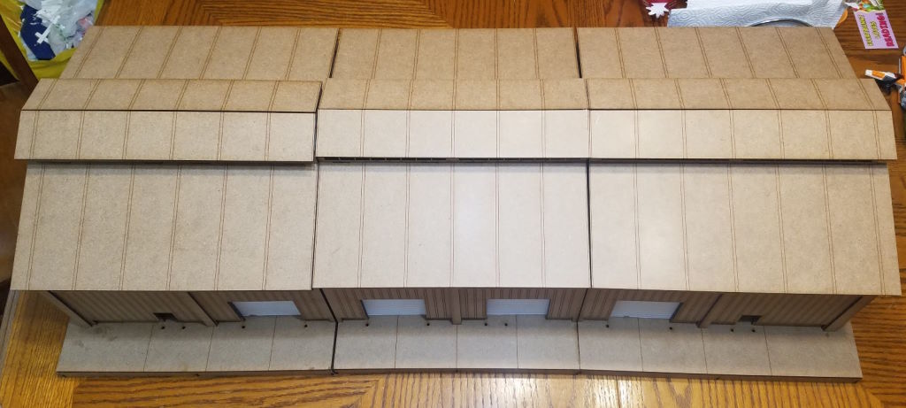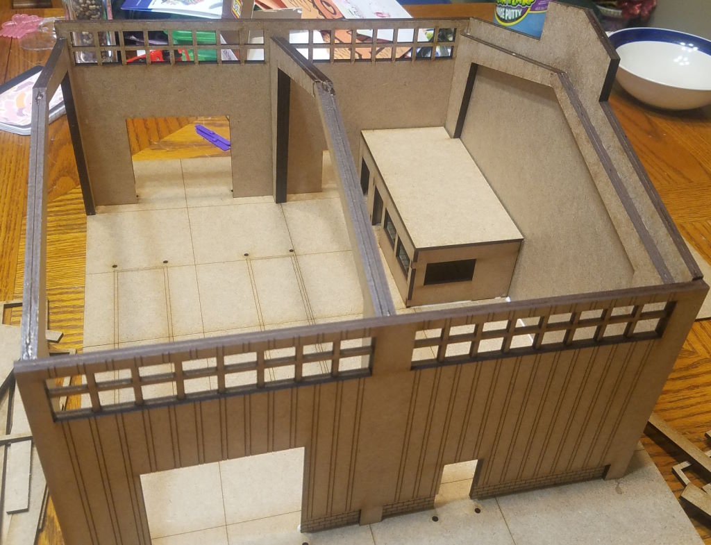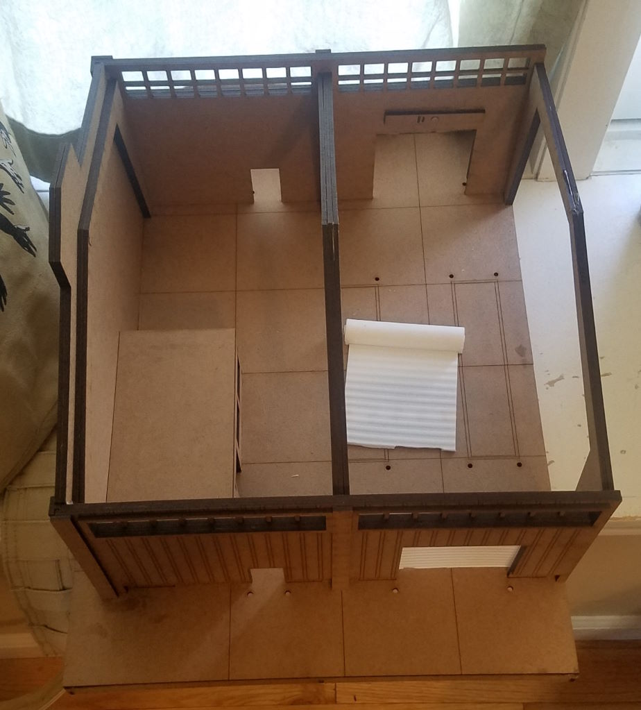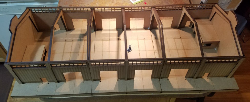 Here’s the entire building assembled without the roof. You can see my tiny guy right in the middle for a sense of scale. The way I put it together, the buildings don’t go together 100% perfectly flush but I’m not bothered by it. MDF warps a bit and glue doesn’t always hold right at the same spot so it happens.