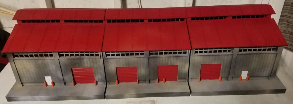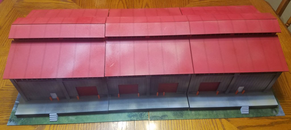 To be honest, I mostly just spray-painted the building. I sprayed the roof, garage doors, doors, and corner guards separately, then did three colors on the building itself (black, gray, tan for weathering). At some point I’ll do more weathering, graffiti, and shrubs growing up, but I have some other hobby projects to finish.