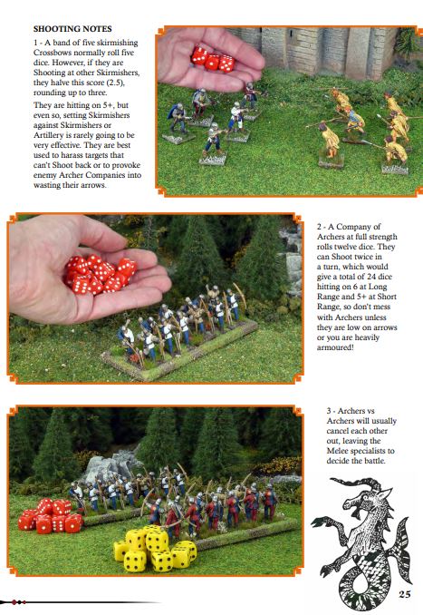 What this edition does add is more different periods to play. They’re pretty much little books or expansions (or codex if you’ve stumbled in from 40k), with an overview of the period and important battles for the time frame. Every period has tweaks to the basic ruleset. This adds some flavor in new units that can be taken, as well as restrictions, representing technological advances that make some units less effective. Some units are even impacted by leadership of the time, or certain tactical uses that changed over the course of history. Next to the “starting period” of the Wars of the Roses (Albion), there are seven different theaters to explore: