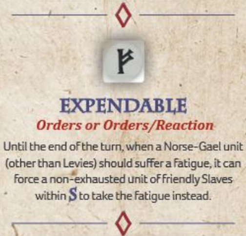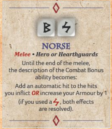 Norse is more complicated - you get to choose one of two effects: change Combat Bonus description to Add an automatic hit to the hits you inflict OR increase your Armour by 1 (if you use a rare symbol, you get both). This is huge! Automatic hits are dastardly, and your units are so low armour to begin with from the heavy weapons and javelins that benefitting your armour is huge. This can be a game-breaker when used at the right time. Note that this can ONLY be used by Heroes or Hearthguards. Closed-ranks Hearthguard using this can be effectively defensive but also doing a bunch of damage with combat bonus dice.