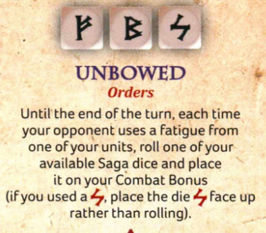 Unbowed allows you to roll available Saga dice into your Combat Bonus when your opponent uses fatigue on your guys. Note that it says 'Orders' underneath, so you have to use it in your own turn, not your enemy's. If you're near the enemy already, you could use
