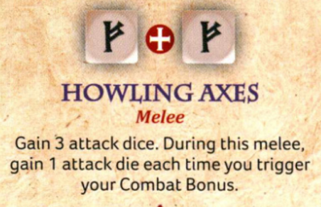 If you're planning for a really decisive combat during your turn, consider putting two common symbol dice on Howling Axes. While I tend to find two-dice abilities less appealing, this one works well with warrior units with heavy weapons charging in. It's less dependent on having available Saga dice to roll into your combat bonus, since it just adds an extra attack die each time you trigger Combat Bonus.