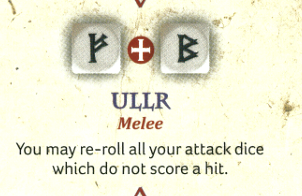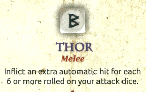 Thor, for one common this is again a huge force multiplier. When combined with Ullr, you'll re-roll misses attempting to get that 6 and get more hits. It's a large investment - three dice for one fight - but if you really need to one something you can virtually guarantee that you do.