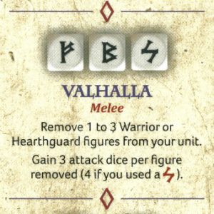 Valhalla. Here's an example: you've just started a melee, so you first add up your Combat Pool, taking X dice for each fighter, based on their status - one for warriors, two for hearthguard. So eight dice for a unit of eight warriors, eight for a unit of four hearthguard. Then you remove 1-3 models to gain three extra attack dice per guy. Removing two warriors gives you an additional six dice, so 14 total, with six left to take hits. Removing two hearthguard gives you an additional six dice, so 14 total, with two left to take hits. This means Warriors can soak up the extra casualties and still have models left over to fight or hold objectives!