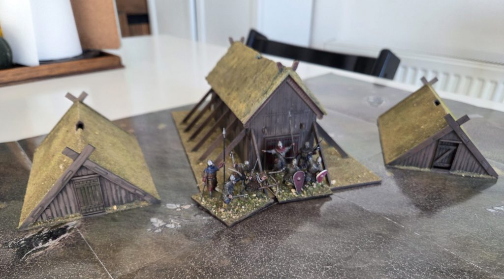 I decided to start with the easiest part of all: The A-Frame houses. These fun little buildings go together really easily, and with just some superglue and activator on the inside joints I had them fixed up in no time. Although they have planked roofs, the pictures on Sarissa's website show these with thatched roofs made with the old brillo-pad technique. For myself, I decided to go with a turf-roofed house, which is also authentic to the period. To do this, I just used some filler to smooth the roof down to the base and then flocked the whole roof as I would the bases on my models.