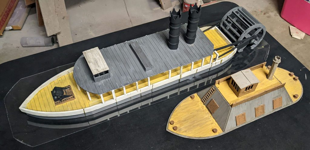 Steamers were obviously used for a lot of things back then - from gunboats, to troop transports, to freight. For this particular scenario - one of the scenarios for the campaign, not necessarily the first - one side will be escorting an operative to the steamer which will then launch and take them to safety. I feel like the steamer will be something that attracts players to the game, but doesn't limit players if they want to play it as part of the campaign at home - they can always just put a dock out and say that's where the operative has to get to. You can see the size of the steamer compared to an MDF ironclad from Sarissa - it's huge.