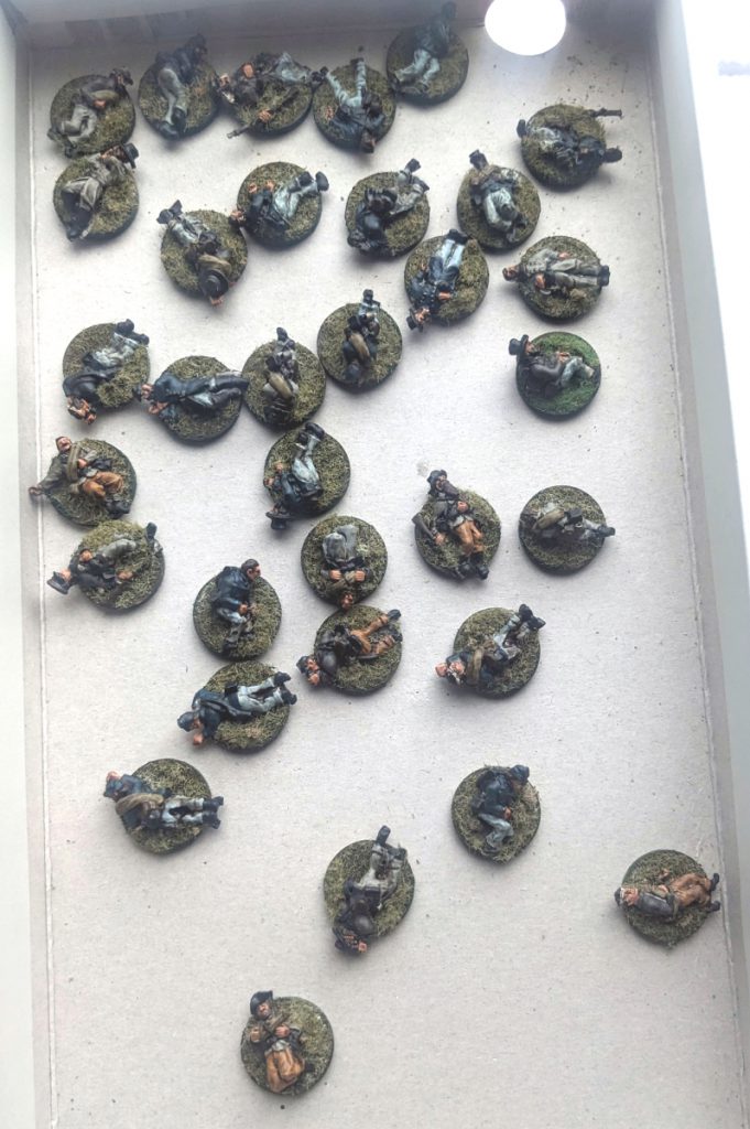 I am just finishing these casualty markers. They're very old sculpts so don't look too close - but they work, and they'll only be on the board if a guy dies. There are some Sash and Saber and Perry mixed in that look great but mostly I just wanted to get them done. I'm also painting some discarded equipment - this is stuff that will take the game to the next level beyond what I've been doing for years, and I'm really excited to have it!