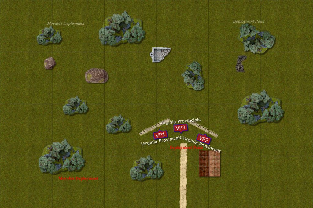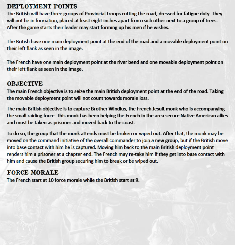 I made some maps up of what I can recall. The provincials started on the board in disarray after hearing gunshots in the distance while chopping wood, clearing a road.