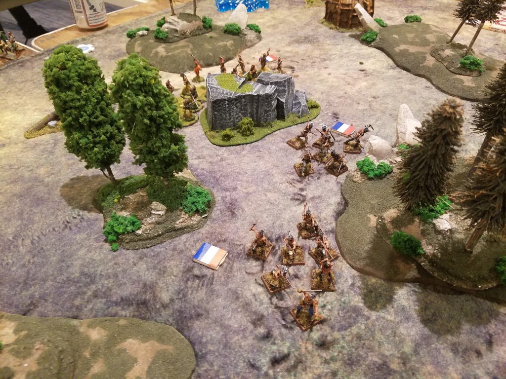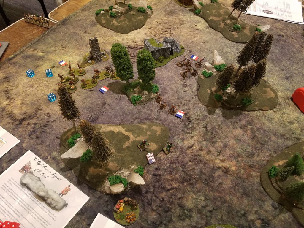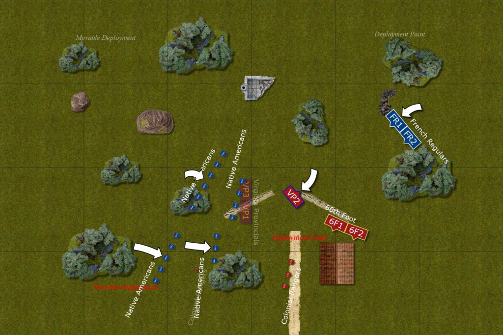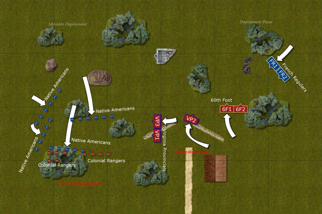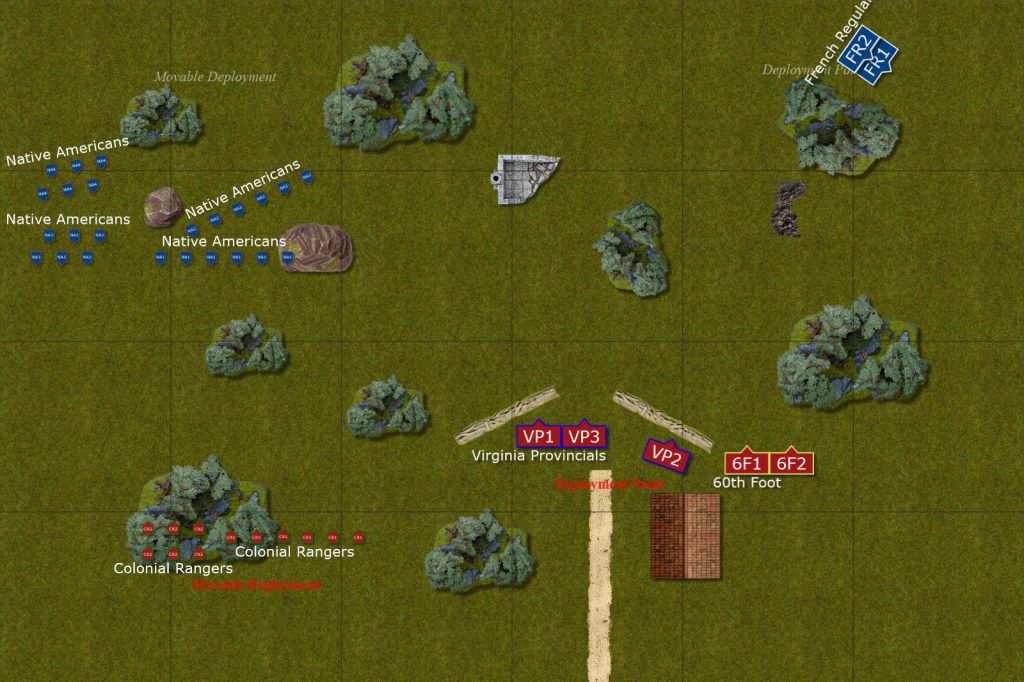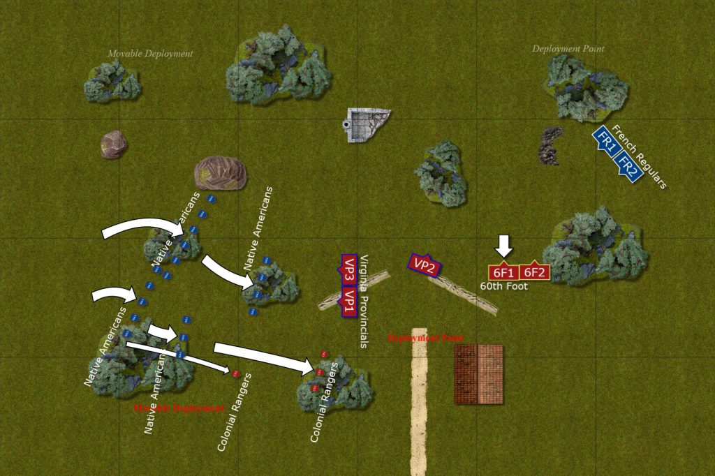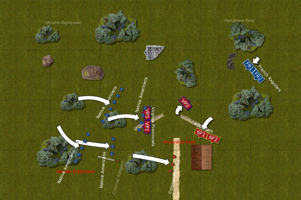 As soon as he could, the provincial captain attempted to marshal his forces, while every unit came on the board before the first tiffin was drawn. French regulars came on at their static deployment point, the Native Americans spread out on their right flank, and the rangers took up the British movable deployment point.