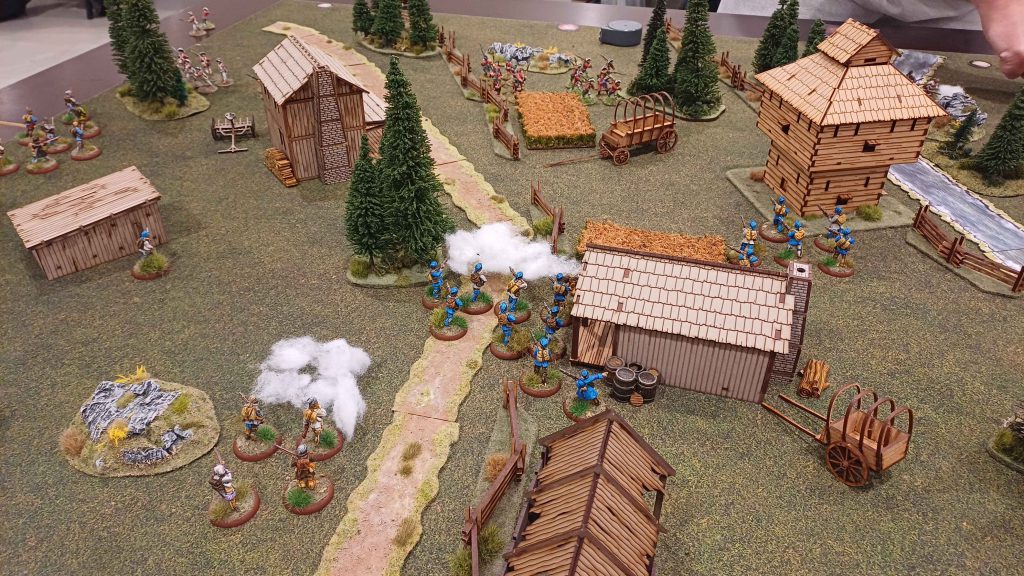 Whether shooting or charging, first you’ll have to see the enemy. The FIW was a conflict known for stealthy movements and ambushes; the spotting mechanic works perfectly here and you don’t even have to roll a die. Basically, you can see everything on the table, with a range of 96”. So a soldier in a bright red coat will be very visible in an open field. But if he’s in woods, you have to subtract a couple of columns from the table. Suddenly that spotting distance is only 24”. Put some hedges or carts in the way and your spotting range drops down to 12”.