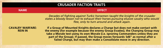 I’d like to highlight a small but important example, the Settled Franks “Rein in” ability. This is a little thing that says a lot (always love this in a ruleset) - Settled Franks, the Western culture that arose in the levant after the first Crusade, can effectively call off a charge if it fails. Charges against highly mobile, evasive Islamic cavalry will fail occasionally/often. Being able to reposition instead of flailing around with your metaphorical arse hanging out is a powerful ability - one that the Crusader list representing forces new to the Levant don’t have, as shown above. It shows a level of adaptation to local warfare that speaks to the acclimatisation, acculturation and diplomacy that existed between the Crusader states and their Islamic neighbours. Settled Franks know how to fight mobile cavalry, because they’ve been doing it a long time - sometimes even alongside Muslim armies. For a two-line rule, that’s a clever bit of work, going above and beyond to show the complex, lived reality of the Crusader states.