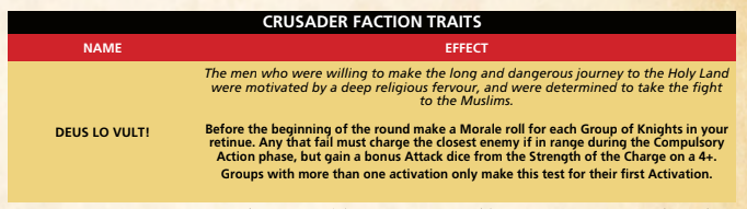 Military Orders are the Hospitalliers, Templars and other smaller Military/Religious orders that slowly became the bulwark of the shrinking Crusader states. They have the potential to be played as a hyper-elite army, ignoring the usual minimum of 10% of your points spent on Green troops. Faction traits can vary between the military orders but in every case help you to stay in the fight longer and hit harder than you’d think given the low model count you’ll probably end up with. A mass of mounted knights backed up by squires, sergeants and Turcopoles from the Settled Franks list is a good bet.