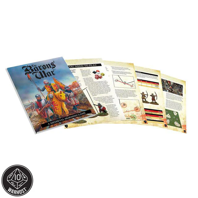 The Barons' War is a fast, "true" skirmish game where you're expecting to put somewhere between 15-40 models on the table, fighting over dense terrain with rules that encourage emergent narrative and investment in "your guys." You're playing warring bands of soldiers fighting the Barons' war, from heavily armoured, mounted knights strapped to the teeth and bristling with weapons through professional sergeantry, mercenaries and Templars, to outlaw bands striking with longbow and quarterstaff from the fringes of the forest.