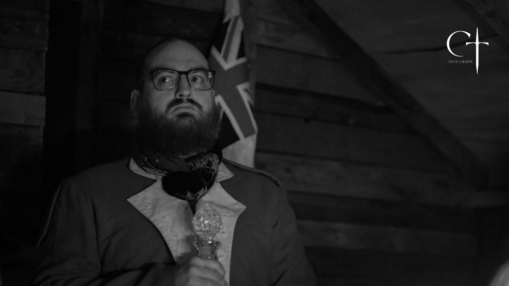 The Forlorn Hope event I attended took place over the weekend of March 21st-23rd, with in-character time-in starting in the evening of the Friday, and time-out just past midday on the Sunday. I had decided to crew for this event rather than play, mostly because money is tight right now, and I didn’t fancy spending a bunch of cash on a musket and redcoat uniform. I only really knew one person attending, and I’d been a bit gun shy about LARP for a while due to a string of not great experiences, so on the evening of the Friday I milled about awkwardly while everyone warmly greeted their old friends. Thankfully, things picked up quickly. Unusually, during the safety and rules brief. The site at Eversley features a ton of custom built structures, including a wild west town (which fits in well with the Napoleonic theming), and a central camp, with several wooden huts (which can be used by players to sleep in) and a big canopied firepit area. It was dark by this point, but even seeing the murky outlines of the players in their full uniformed regalia in this cool environment was enough for my excitement to start to overcome my anxiety. After the briefing, those not playing headed back to the crew tent for their briefing.