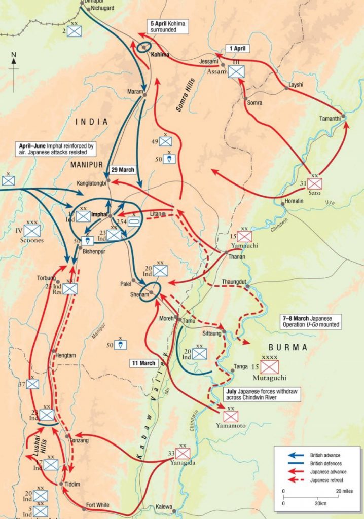 The renewed Indian National Army would first see action in March 1944 as part of Operation U-Go, the Japanese offensive towards Manipur that aimed to open the way into India. The initial plan was for the INA to be used primarily for espionage and propaganda during this offensive, but Bose managed to succeed where Mohan Singh had previously failed, convincing the Japanese to treat the INA as a proper allied army. The requirement for espionage was met instead by the INA’s Bahadur Group, a special services unit attached to Japanese forces to spread propaganda and act as scouts. The plan was that once the Japanese broke through the British lines at Imphal and Kohima, the INA would travel further into India and act as a guerilla army, living off the land and captured British supplies. That way, even if Japan lost the war, the INA could inspire a popular uprising and make it extremely difficult for the British Empire to retain control of India.