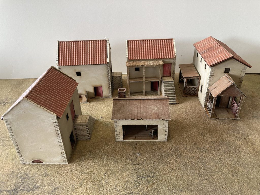 Empires at War to make a small town and they went together really nicely. They're pre-painted except for the roof - I did a small wash and drybrush and they look awesome.