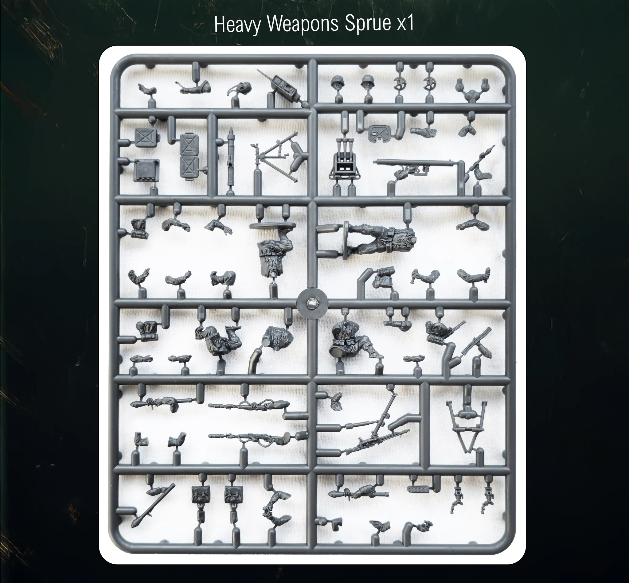 This bag of minis comes with 44 miniatures, with all kinds of weapon options to be expected in a modular infantry platoon. This includes medium machine guns, medium mortars, Panzerschrecks, Panzerfäuste, Radios, medical equipment and AT rifles. To avoid the duplicate look, every sculpts has one or more alternate build options. There is some inconsistency between certain sculpts, with the majority having a plastic putty base and some having none. In particular, the crew of the Machine gun and all of the prone bodies do not have a putty bases. As with every Victrix set, this box does not come with bases, so you will have to source your own, I bought two bags of the renedra cobblestone bases for this set specifically. Now as I mentioned before this set doesn't only have your typical squad weapons like LMGs, Panzerfäuste and the occasional officer head, on an extra sprue you have all the extra pieces to make this an effective fighting force out of the box(or well bag). There are the crew and parts for the two medium weapon teams, a Panzerschreck, a radio for forward observers and AT rifles.